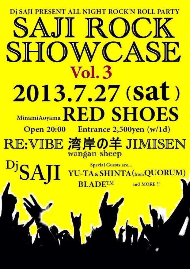 RE:VIBE 2013 Summer Live Vol.2 DJ SAJI from Mishuku BLACK & Minamiaoyama Red Shoes Presents [SAJI ROCK SHOW CASE Vol.3] Date: 2013・7・27 (Sat) Place: MinamiAoyama Red Shoes Act: RE:VIBE, Wangan Sheep, JIMISEN Guest: BLADE™ with QUORUM and more!! Open: 20:00 Start: 21:00 Price: